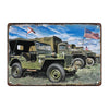 Este letrero metálico de Jeep destaca una escena cautivadora donde los famosos vehículos militares Willys Jeep y los camiones estadounidenses, alineados con orgullo bajo un cielo azul, dan testimonio de su papel central en la historia. Su icónico color caqui, sus banderas ondeantes y sus meticulosos detalles de diseño capturan la esencia de un pasado heroico. Este impactante diseño te transporta instantáneamente a una época en la que cada motor contaba una historia de resiliencia y determinación, lo que lo convierte en la opción perfecta para los entusiastas de los vehículos militares o la historia.