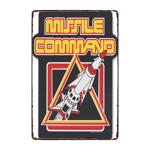 Cette Plaque Métal USA Missile capture l’essence même du mythique "Missile Command" d’Atari, avec son missile stylisé en pleine ascension, prêt à intercepter les attaques ennemies. Les couleurs éclatantes – rouge, jaune et blanc – tranchent sur le fond noir profond, recréant l’esthétique caractéristique des bornes d’arcade des années 80. La typographie audacieuse, aux contours épais et aux lettres anguleuses, renforce l’immersion dans cet univers où stratégie et réflexes faisaient loi.
