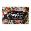 Ce collage rétro haut en couleurs rend hommage à l’icône absolue des boissons gazeuses : Coca-Cola. Entre capsules rouillées, pin-up au sourire éclatant, bouteilles en verre légendaires et slogans d’époque, cette plaque réussit l’exploit de rassembler en un seul visuel l’imaginaire entier de la marque culte. L’effet vieilli du métal et les textures volontairement usées renforcent son authenticité, tandis que le logo central “Drink Coca-Cola” trône fièrement au cœur de cette fresque nostalgique.