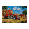 Cette Plaque Métal Massey Ferguson illustre une scène champêtre d’une époque où l’agriculture reposait sur un subtil équilibre entre savoir-faire humain et machines robustes. Au premier plan, un magnifique tracteur Massey Ferguson 35, reconnaissable à sa couleur rouge éclatante et à son design intemporel, avance à travers un champ fraîchement moissonné. Les agriculteurs s’activent autour d’une charrette chargée de bottes de paille, tandis qu’en arrière-plan, une presse bat encore le blé sous un ciel d’été radieux. L’atmosphère chaleureuse et vivante de cette scène évoque un temps où chaque récolte était un moment clé du cycle agricole, marqué par l’effort collectif et la fierté du travail bien fait.