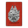 Représentant avec précision le Faucon Millenium vu du dessus, chaque détail du vaisseau emblématique est sublimé dans un contraste frappant entre les nuances métalliques et l’arrière-plan rouge profond. La perspective réaliste accentue la sensation de puissance et de mouvement, comme si l’appareil s’apprêtait à bondir en hyperespace. Cette plaque évoque immédiatement l’univers fascinant des batailles galactiques, des contrebandiers intrépides et des missions périlleuses aux confins de l’espace.