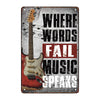 Cette Plaque Métal Musique capte immédiatement l’attention avec son visuel saisissant : une guitare électrique rouge vieillie, marquée par le temps et l’intensité des performances, se dresse fièrement à côté de la célèbre citation "Where Words Fail, Music Speaks". Ce message fort résonne auprès de tous ceux pour qui la musique est bien plus qu’un simple divertissement, mais une véritable échappatoire, un langage universel qui transcende les émotions. Le fond texturé, aux teintes usées et aux notes de musique esquissées en arrière-plan, rappelle l’univers brut des salles de concert et des studios d’enregistrement, ajoutant une profondeur visuelle et une authenticité remarquable.