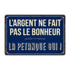 Ajoutez une touche de bonne humeur à vos murs avec cette Plaque Métal Pétanque, dont le message résume à lui seul tout un art de vivre : “L’argent ne fait pas le bonheur, la pétanque oui !”. Sur fond bleu profond patiné, orné de filets blancs façon plaques émaillées d’époque, les lettres en typographie rétro évoquent les devantures des cafés de village, les placettes ombragées, le pastis bien frais et les après-midis à tirer ou pointer en toute décontraction. C’est une véritable déclaration d’amour à la convivialité et au plaisir simple du jeu entre amis.
