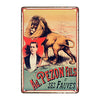 Cette Plaque Métal Pezon immortalise l’univers des grandes exhibitions animalières du XIXe siècle, époque où Adolphe Pezon, figure emblématique du monde du cirque, régnait en maître sur la scène des spectacles de fauves. Le visuel saisissant met en avant un lion imposant, symbole de puissance et de domination, accompagné du portrait du célèbre dompteur encadré dans une mise en scène théâtrale aux couleurs vives. L’association du rouge profond et du vert pastel, contrastant avec le fond vieilli, confère à cette affiche un charme vintage indéniable, digne des illustrations publicitaires les plus marquantes de l’époque.