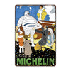 Cette Plaque Métal Pub de Pneus Michelin vous transporte dans un univers rétro, où l’on voit le Bibendum offrir une bague de pneu à un homme, le tout dans une ambiance art déco très caractéristique de l’époque. Le fond aux couleurs vives et l’illustration dynamique témoignent du style unique de René Vincent, qui a su allier humour, originalité et efficacité publicitaire. Le visuel est à la fois ludique et iconique, capturant l’essence même de l’image de la marque et son lien avec l’automobile et la route.