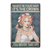 Cette Plaque Métal Publicitaire de Coiffeur met en scène une belle pin-up des années 50, coiffée de rouleaux, et incarne parfaitement l’esprit de cette époque où la coiffure était un art et un symbole de féminité. L’inscription "Invest in your hair, it’s the crown you never take off" ajoute une touche d’humour et de sagesse, en soulignant l’importance de prendre soin de ses cheveux, véritable "couronne" de beauté. Le fond aux teintes bleues et les motifs géométriques complètent l’atmosphère rétro de cette illustration, apportant une touche d’élégance à votre décoration.