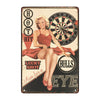 Cette Plaque Métal Publicitaire Fléchettes vous plonge dans l’univers des jeux d’arcade et des compétitions amicales avec son visuel rétro mettant en scène une jolie pin-up aux cheveux blonds, un clin d'œil espiègle et une tenue élégante, en train de poser près d’une cible de fléchettes. L’inscription "HOT HIT" et "LUCKY SHOT" évoque l’excitation d’un tir réussi, tandis que "Aim for a BULLS EYE" incite à la précision et à la réussite dans ce jeu légendaire. Le tout est habillé d’un style graphique vintage, avec des couleurs vives et un design inspiré des publicités d’antan.