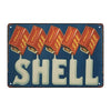 Inspirée d’une célèbre affiche britannique de 1929, cette plaque met en scène cinq bidons rouges de “Shell Motor Spirit” versant chacun une lettre du mot SHELL, comme s’ils étaient les artisans mêmes de la marque. Avec son fond bleu profond, ses lettres blanches généreusement stylisées et sa composition en cascade d’une modernité éclatante, cette œuvre rend hommage à l’univers du design industriel et à l’âge d’or de la réclame.